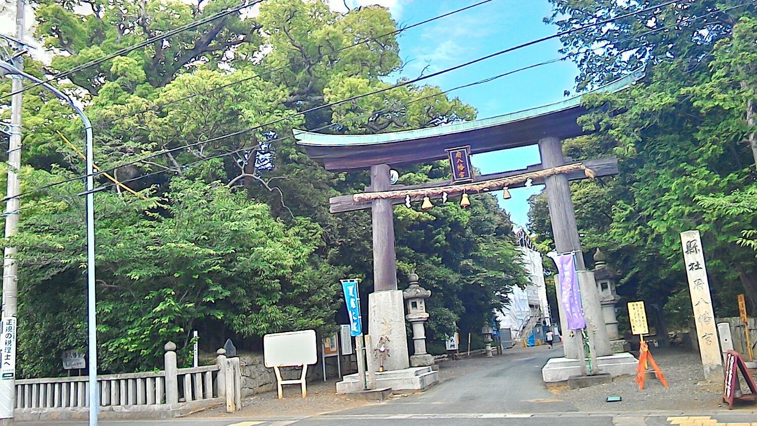 向かい側には、鬱蒼と茂る森を擁する八幡社。